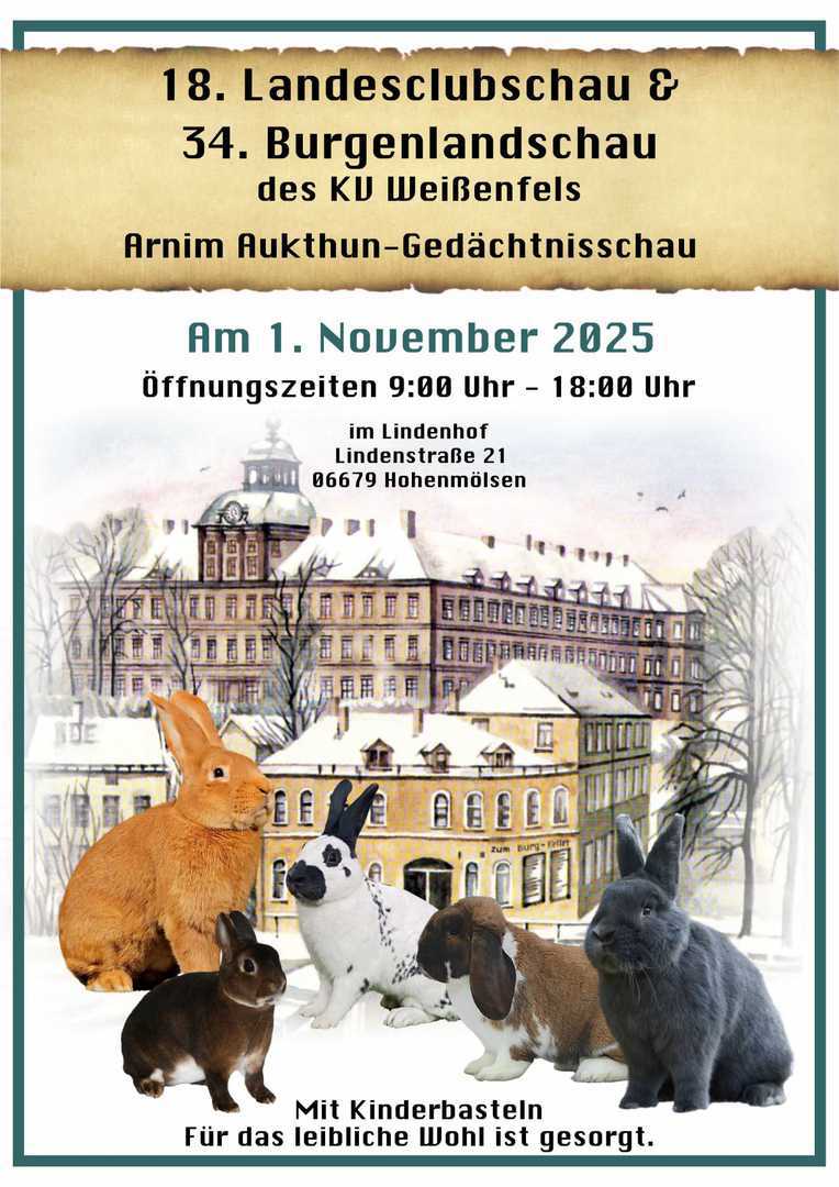 Am 01. November 2025 richten die Mitglieder des KV Weißenfels und des Hermelin-und Farbenzwergeclub Sachsen-Anhalt die 18. Landesclubschau der Vereinigten Clubs Sachsen-Anhalt aus. Angeschlossen an diese Veranstaltung ist die 34. offene Burgenlandschau des KV Weißenfels.
