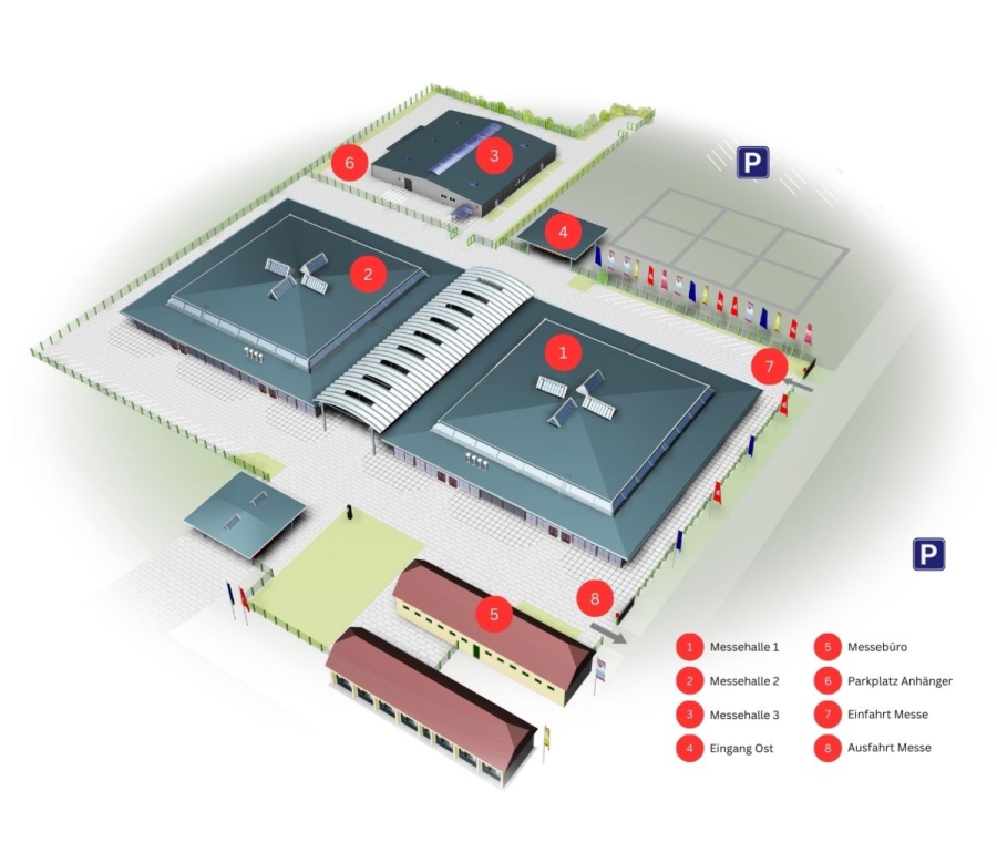 In den Messehallen 1 und 2 werden die Kaninchen untergebracht sein. Dort werden auch die Industrieaussteller zu finden sein. Die Halle 3 ist für die Versorgung der Besucherinnen und Besucher und die Exponatenschau vorbehalten. Im Umfeld der Messehallen befinden sich zahlreiche Parkplätze, die gegen eine Parkgebühr genutzt werden können. Durch die Landeshauptstadt Magdeburg sind dort Parkautomaten aufgestellt. Ein Tagesticket kostet 5 EUR. Für die Zuchtfreundinnen und Zuchtfreunde, die einen Sammeltransport begleiten und ihren Anhänger auf der Messe abstellen möchten, können dies gegen eine Gebühr von 50 EUR auf dem Messegelände tun. Die Parkgebühren können vor Ort entrichtet werden. Das Parken auf dem Messegelände bleibt ausschließlich der Ausstellungsleitung vorbehalten und wird durch die Messe Magdeburg streng überwacht.